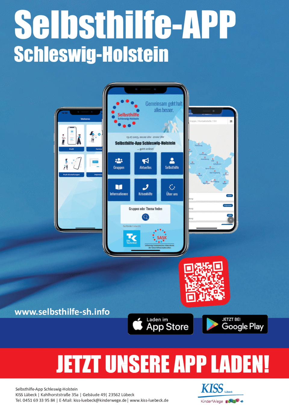 Die Selbsthilfe-App Schleswig-Holstein wurde mit Unterstützung der Techniker Krankenkasse entwickelt und von allen 14 Selbsthilfekontaktstellen im Land gemeinsam umgesetzt. Herausgeber ist KISS Lübeck.